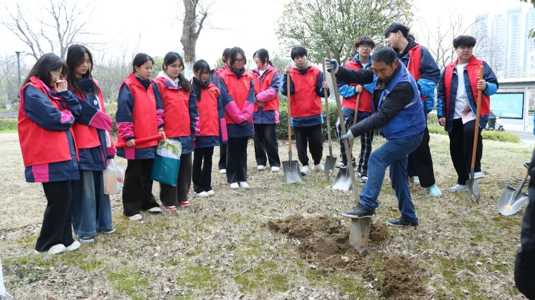 活动现场,社区工作人员为同学们详细讲解了植树的步骤和注意事项,包括挖坑的深度、扶苗填土等。同学们则围拢在旁认真学习,听的津津有味。