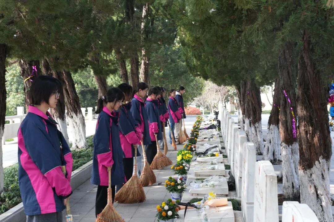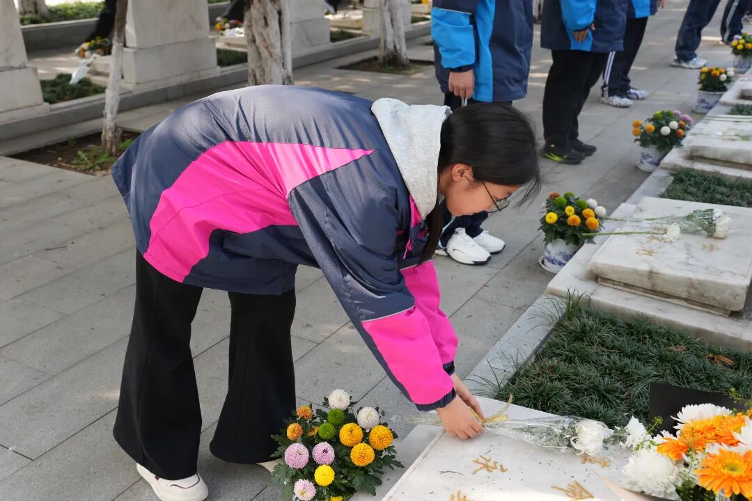 伴随着庄严的国歌,祭扫仪式正式开始。全体师生队列整齐,神情肃然,怀着无比崇敬的心情向革命烈士们致默哀,寄托哀思。学生代表敬献花圈、扫墓鲜花,向为民族独立、人民解放英勇献身的英烈们致以最深切的缅怀与最崇高的敬意。
